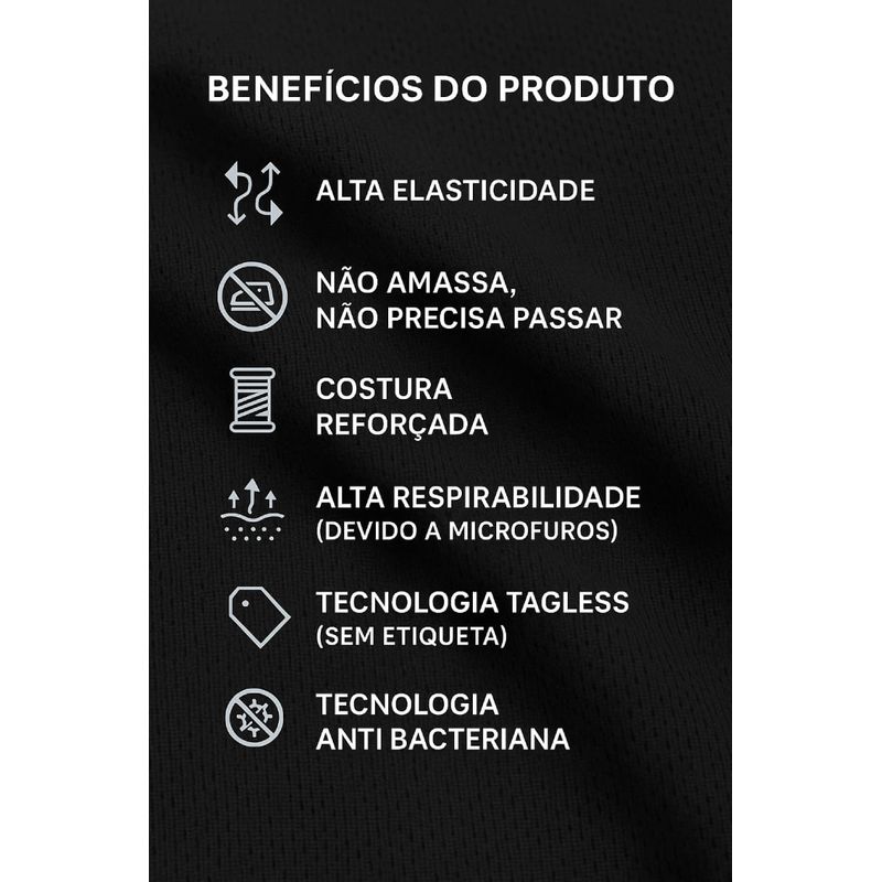 - Tecido Dry Fit Premium: leve, respirável e com microfuros que favorecem a ventilação.